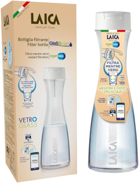 Laica GlasSmart 1,1 literes üveg vízszűrő palack FAST DISK szűrővel – azonnali szűrés, tiszta víz egyetlen mozdulattal. Tartós, újrahasználható üveg, klórmentes, ízletes víz, környezetbarát megoldás.